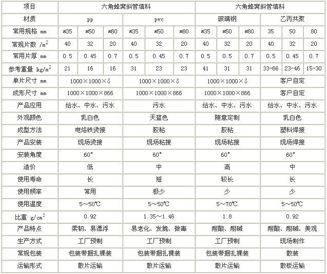 蜂窩斜管(板)填料技術參數一覽表(參考)