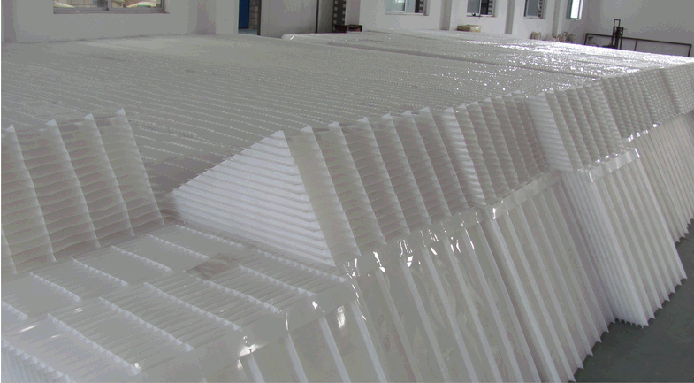 斜板填料主要由共聚及聚丙烯材料混合制成。從淺層理論的基礎(chǔ)講,在斜板上部設(shè)置沉淀距離合理的沉淀段,在下部控制斜板的幾何形狀,使斜板下部形成穩(wěn)定的接觸絮凝段,通過接觸作用和淺池沉淀機(jī)理達(dá)到礬花與水分離的目的。各種間距斜板填料均是通過不同高度的塑料肋條來支撐斜板片,肋條與斜板熱熔焊接,每兩層斜板片之間需要多根肋條支撐,組裝工藝復(fù)雜,而且傳統(tǒng)斜板內(nèi)部水流流道成矩形,常適用于上向流沉淀池。 斜板填料規(guī)格參考表(備注:斜長為1m計(jì)算) 片厚(單位:mm) 平板(單位:張) 重量(單位:kg) 肋條(單位:根) (板間距)25 0.8 32 33 7 1 32 39 7 (板間距)28 0.8 30 32 7 1 30 37 7 (板間距)30 0.8 28 30 7 1 28 35 7 (板間距)50 1 18 26 7 (板間距)80 1.5 11 25 7 (板間距)100 2 8 24 7